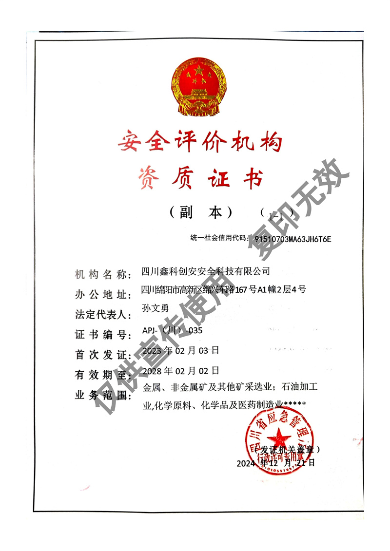 四川鑫科創(chuàng)安安全科技有限公司成立于2020年,是川北地區取得資質的民營安全評價機構(資質證書編號:APJ-(川)-035)。并于2022年牽頭成立綜合應急救援隊伍 - 綿陽曙光應急救援中心。